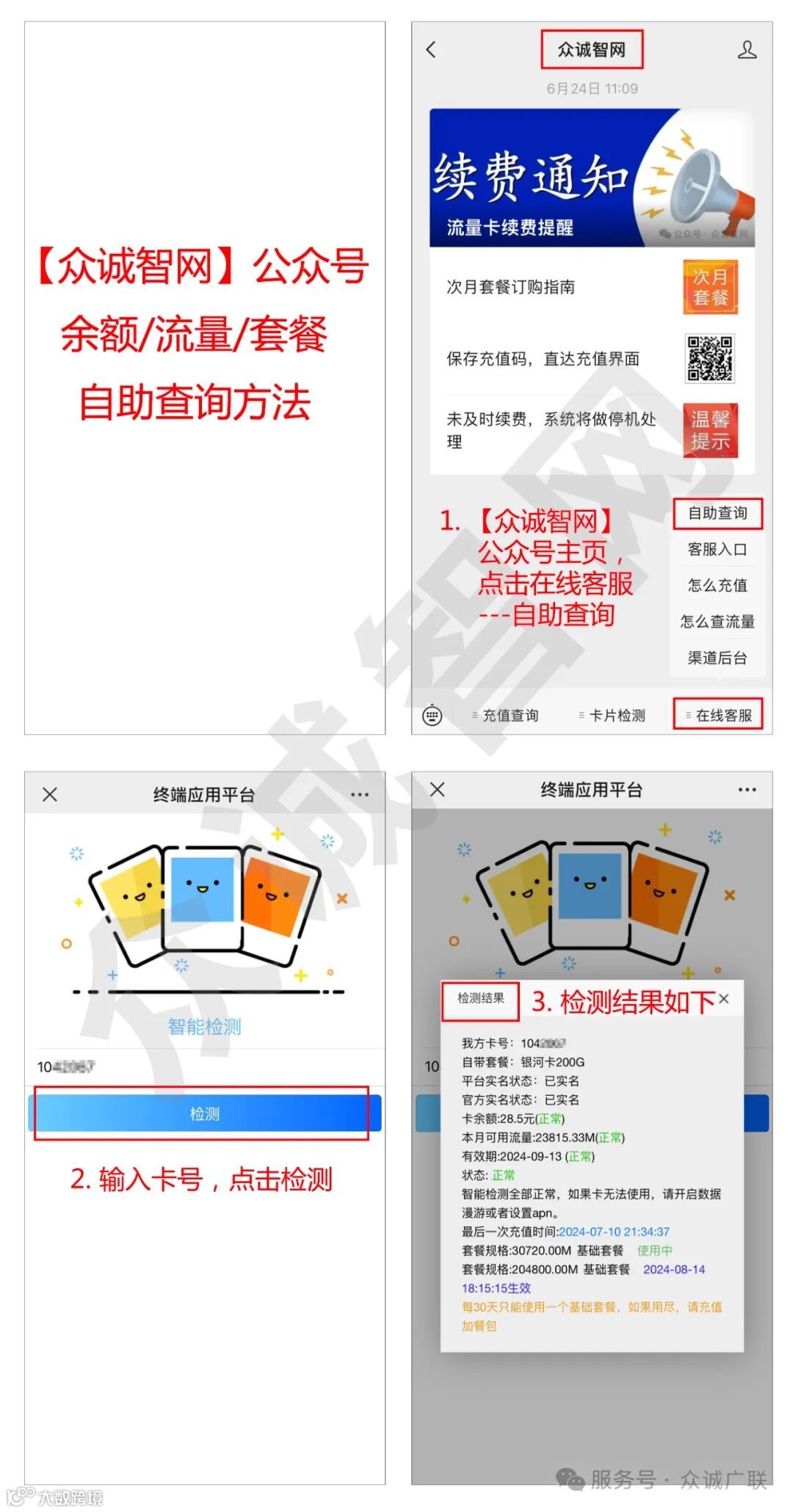 您也可以在公众号右下角点击“在线客服--自助查询”,查询卡片状态、余额、套餐等信息。自助查询方法如下: