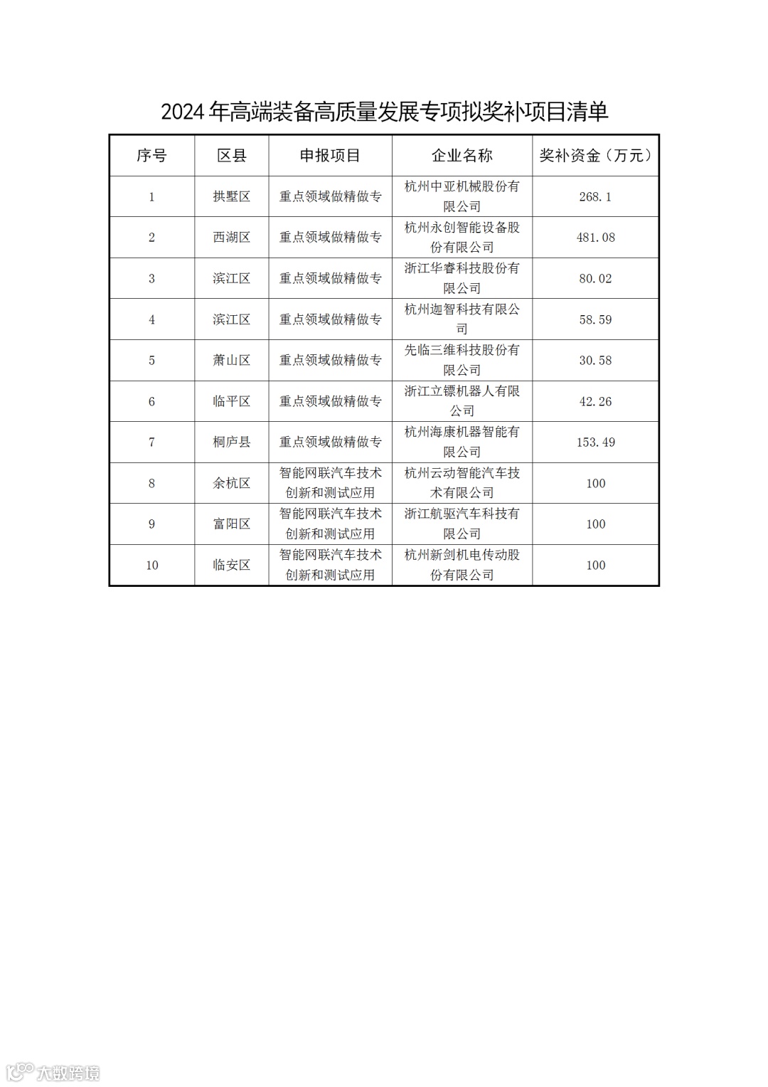 根据《加快推进高端装备制造业高质量发展若干措施》要求,杭州市经信局组织了2024年度高端装备高质量发展专项申报工作。经企业自主申报、区县初审推荐、市级专家评审和局党组会审议等程序,“浙江华睿科技股份有限公司”等企业的10个项目符合资助条件。