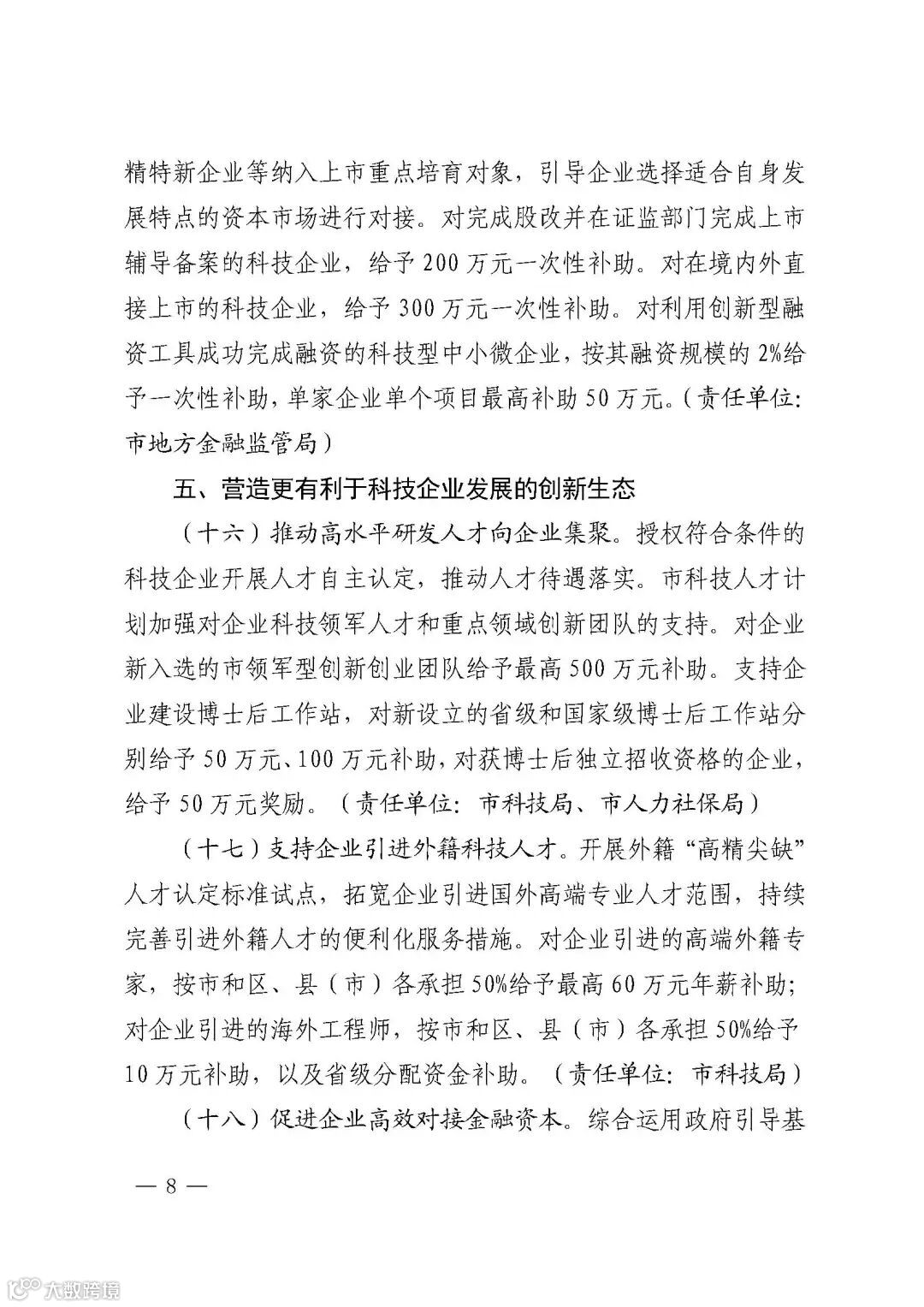 (十五)支持科技企业登陆资本市场。将高新技术企业、专精特新企业等纳入上市重点培育对象,引导企业选择适合自身发展特点的资本市场进行对接。对完成股改并在证监部门完成上市辅导备案的科技企业,给予200万元一次性补助。对在境内外直接上市的科技企业,给予300万元一次性补助。对利用创新型融资工具成功完成融资的科技型中小微企业,按其融资规模的2%给予一次性补助,单家企业单个项目最高补助50万元。(责任单位:市地方金融监管局)