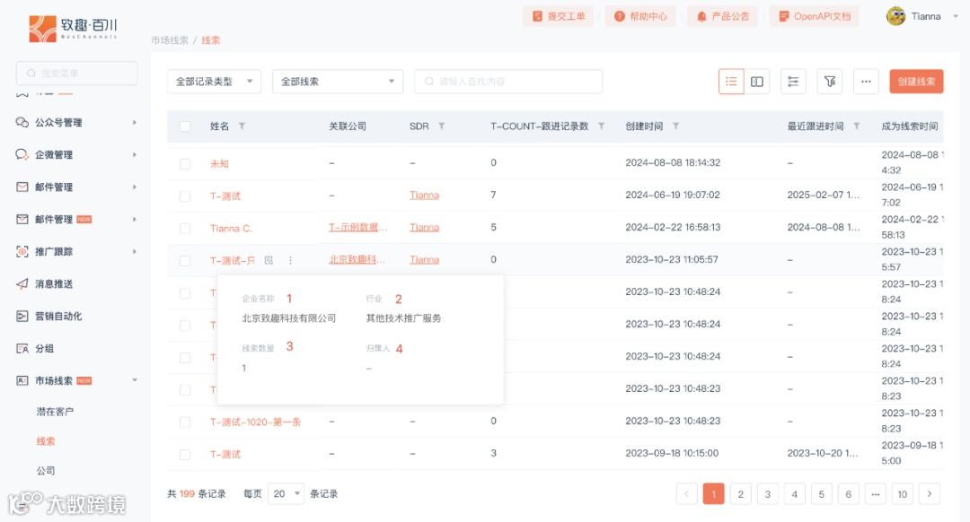 相关页面:点击公司详情页面-相关处,展示市场线索数据,点击即可查看市场线索字段。