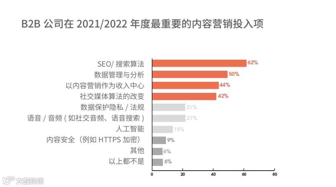 根据埃森哲的《B2B业务的破局之道》报告表明,88%的B2B交易从线上开始,而有75%的客户将社交媒体作为产品研究渠道。且在在疫情之下,持续的数字互动在疫情下已成为常态。对于企业来说,构建流畅而高质的线上内容体验则在重要之余,更具时代意义。那么从哪里入手呢?CMI指出营销人们认为2022年最需要投入的内容营销选项如下,从以下方面进行升级是更合适的选择。