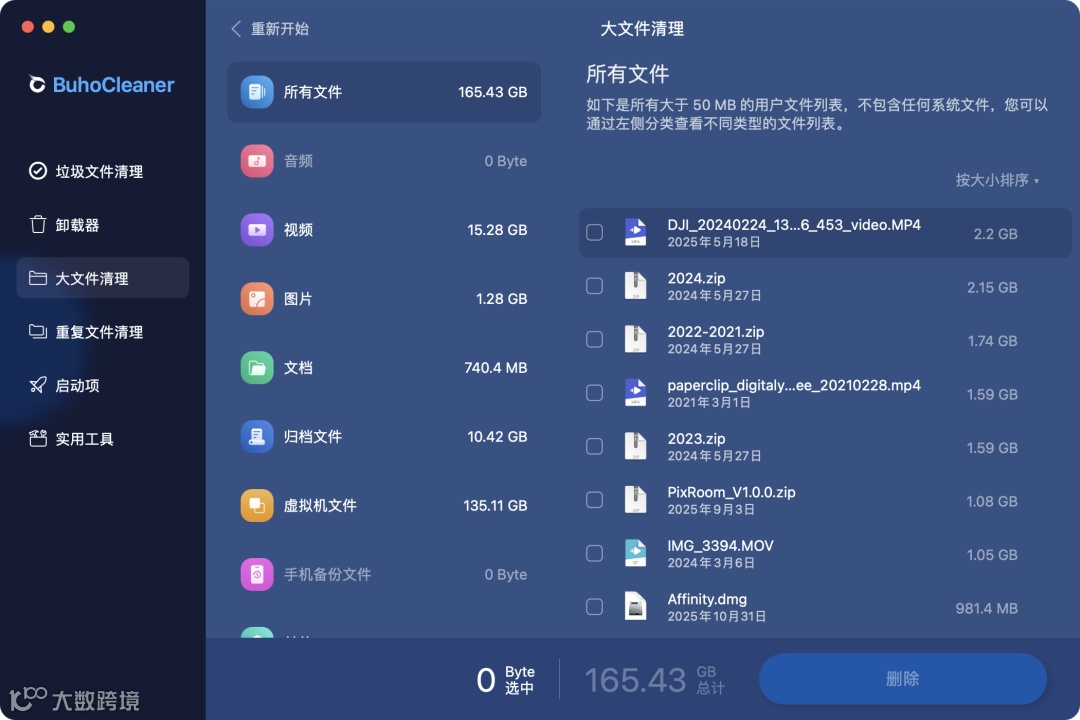 支持系统缓存日志、Xcode 垃圾等数据的扫描与清理,对于大文件也能根据大小排序,快捷进行清理,重复文件同样轻松移除。