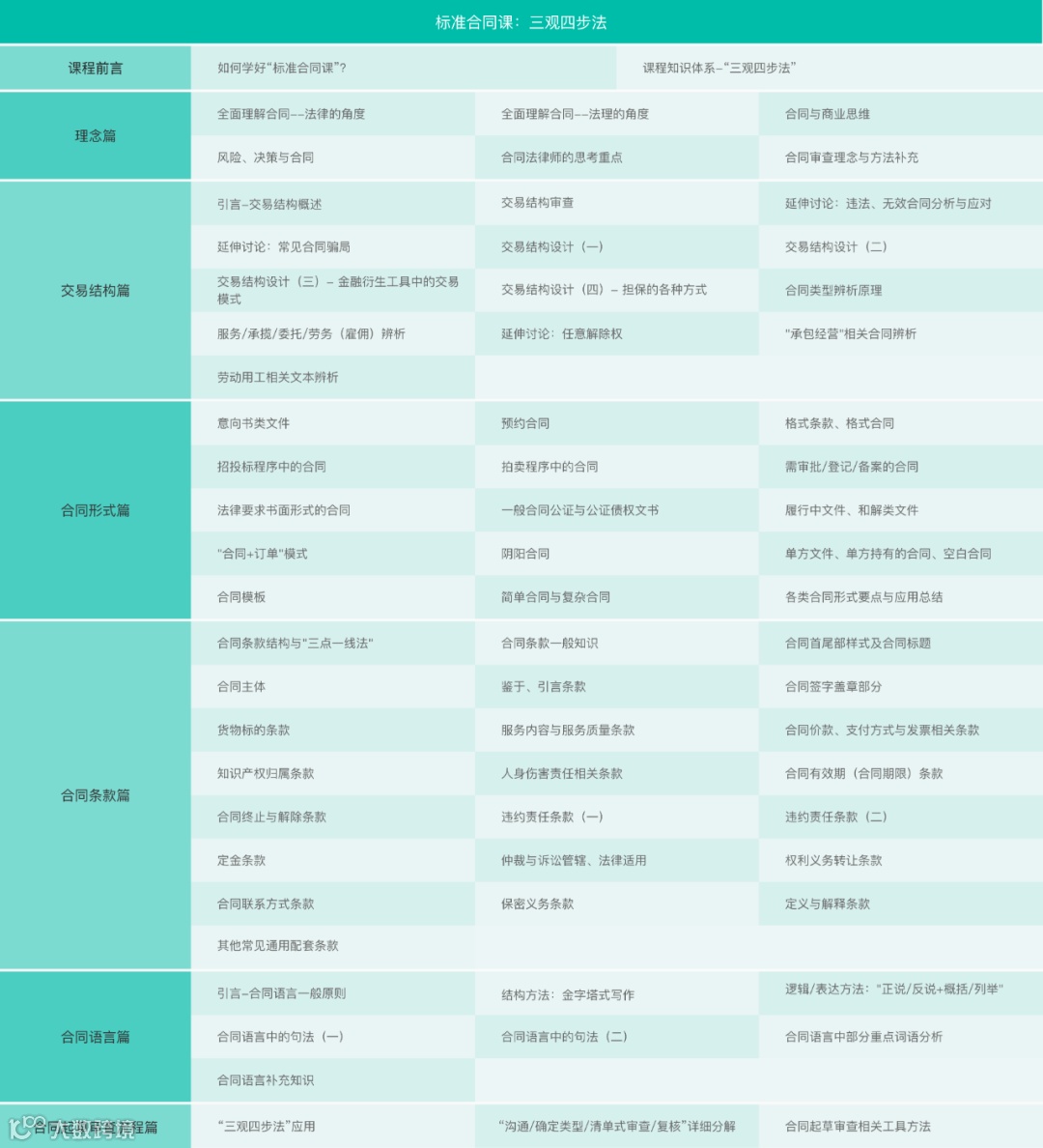 「三观四步法」讲授所有合同通用的、标准的起草审查知识与方法,类似于民法典合同编中的“通则”,学完这门课,能够大大提升合同起草审查的水平,对所有合同都可以进行宏观、中观、微观三个层面的分析。