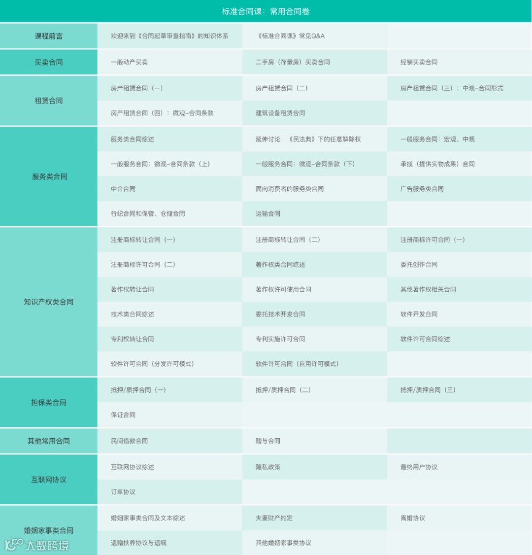 这一整套的合同知识体系,做成的课程称作「标准合同课」。这套课程的目的,是为法律人提供一整套关于合同起草审查的标准化的、体系化的知识和指引,而不是零散的经验汇编。