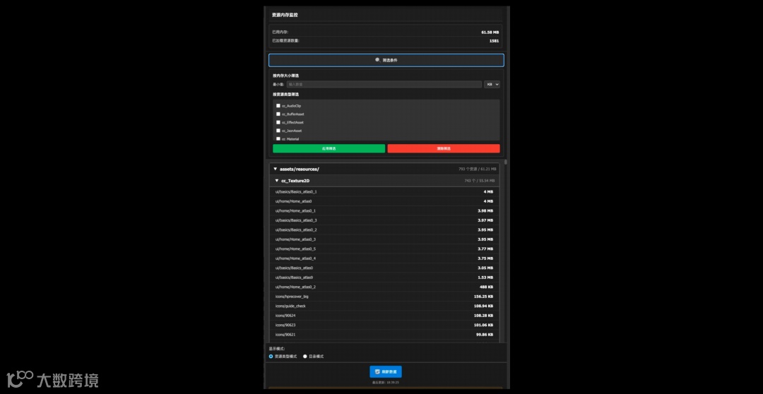 项目运行时出现卡顿,怀疑是资源加载过多导致的内存压力。传统方式只能靠经验猜测或编写复杂的统计代码。