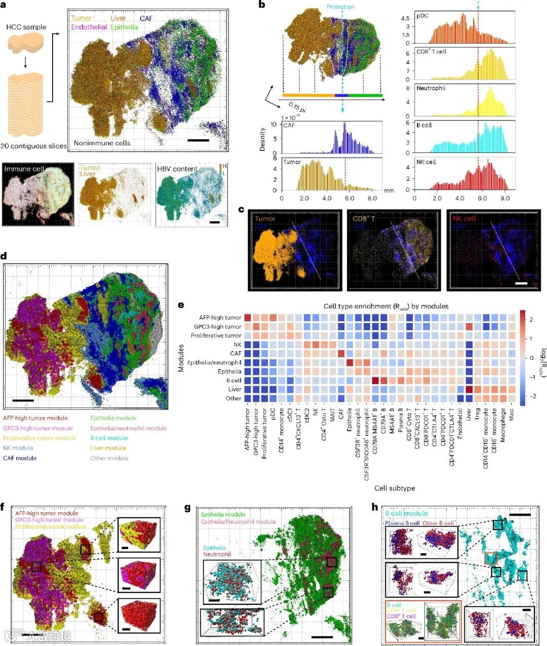 通过20张连续切片构建准3D图谱(121.8万细胞,32类)(图5a):CAF形成物理屏障阻碍CD8⁺ T细胞和中性粒细胞浸润至肿瘤核心,而NK细胞可穿透并在肿瘤前沿聚集(图5b,c)。空间模块分析显示:肿瘤区域存在3种肿瘤富集模块空间交错(图5f);非肿瘤区域中性粒细胞与EPCAM⁺上皮细胞共定位(图5g);2D中孤立的B细胞簇在3D中连接成淋巴网络,内部富集CD4⁺/CD8⁺ T细胞和浆细胞,但缺乏生发中心结构(图5h)。该发现揭示CAF介导的免疫浸润屏障及肿瘤核心-边缘的免疫响应差异。
