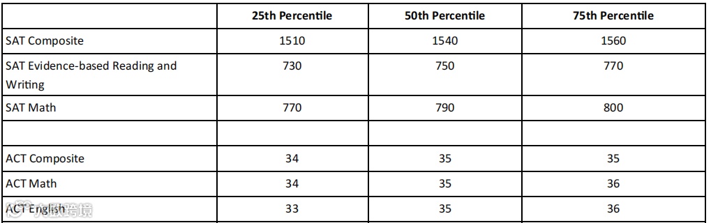 SAT成绩:25%分位数为1390,中位数1442,75%分位数1520