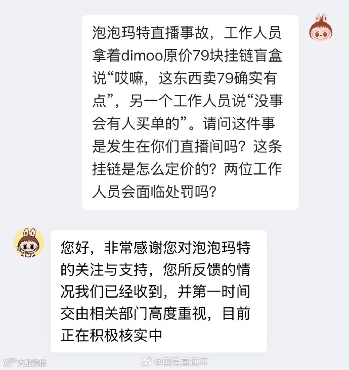 对此,中新网国是直通车问询涉事直播间。该直播间回应称:非常感谢您对泡泡玛特的关注与支持,您所反馈的情况我们已经收到,并第一时间交由相关部门高度重视,目前正在积极核实中。