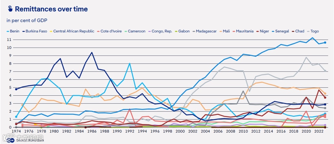1974-2022年间非洲法语国家侨汇额占GDP的百分比