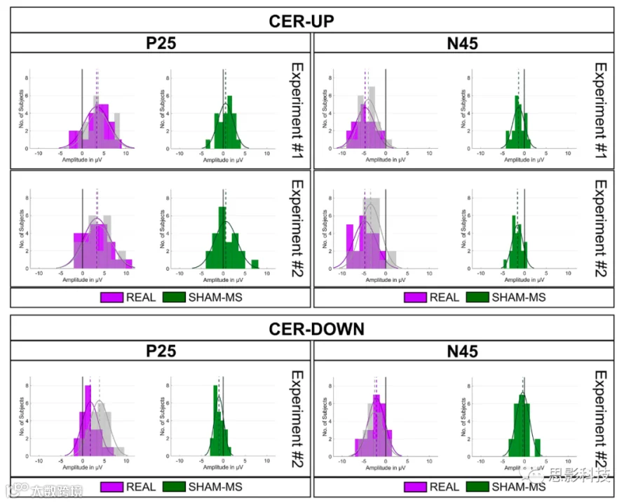 从涉及cbTMS(CER-UP、CER-DOWN)条件的cb-P25和cb-N45振幅分布的分析中,可以观察到cb-P25和cb-N45以及SHAM-MS反应通常呈正态分布(图8)。SHAM-MS反应的期望值始终接近0微伏,而REAL反应与SHAM-MS反应显著不同(图8)。因此,可以观察到对于这些短潜伏期反应,REAL减去SHAM-MS反应的振幅分布和期望值与REAL反应非常相似。这表明,为了可靠测量早期TEPs(cb-P25、cb-N45),不需要通过假条件进行校正。这一观点得到了最近一项应用可比SHAM-MS条件的研究的支持,该研究涉及对肩部进行磁刺激,发现在60毫秒前由感觉输入引发的EEG反应与TEPs没有重叠,以及其他之前的研究也没有发现这些反应在70毫秒前与TEPs重叠。从上述分析中得出的个别cb-P25和cb-N45反应的小提琴图可以在补充材料中找到(图S7),在其中可以观察到反应的个体差异。