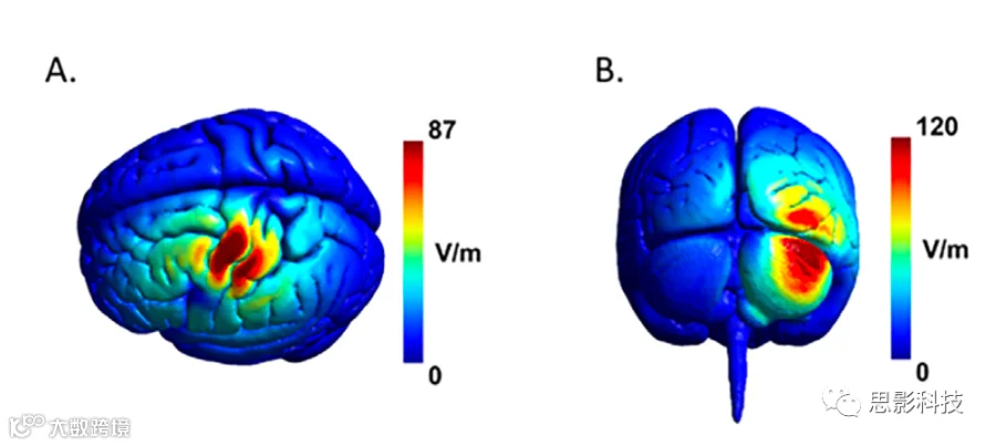 对M1上TMS引起的电场的仿真结果显示,电场集中在中央前回,平均峰值强度为87 V/m。关于小脑目标,引起的电场集中在右侧后叶的横裂周围,平均峰值强度为120 V/m,电场也涵盖了一些枕叶下部-后部区域(图3)。