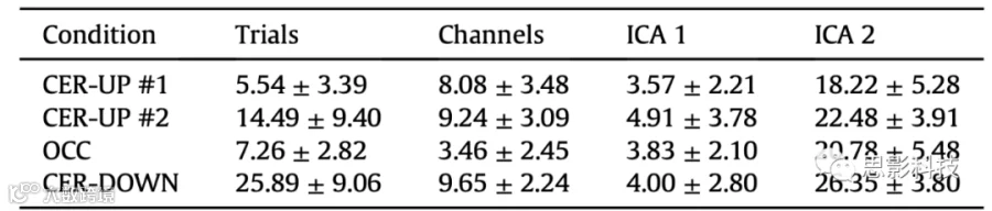 表1. 试次、通道:移除试次或通道的平均数±1标准差的百分比。独立成分分析(ICA):移除成分的平均数±1标准差。