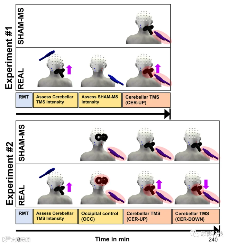 上排:实验#1条件的顺序,分为SHAM-MS和REAL,这些条件是随机交错提供的。粉红色背景标识了在各自条件下用于刺激的线圈,REAL和SHAM-MS中线圈的位置相同。