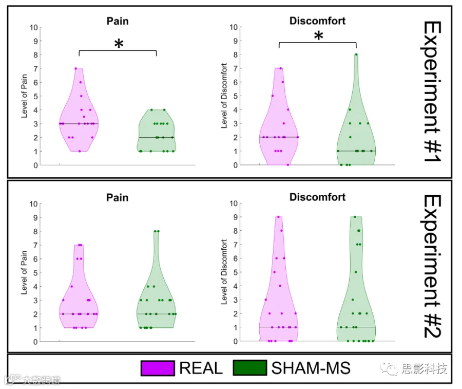 每次实验完成后,受试者需要填写两个数值评分量表(NRS),评估感知到的疼痛和不适程度,量表范围从0到10,0表示没有疼痛或不适,10表示可以想象的最高疼痛或不适[26]。在前两个量表中,受试者被要求指出他们认为是REAL的试验中感知到的疼痛或不适,在第二个量表中为他们认为是SHAM-MS的试验(图2)。