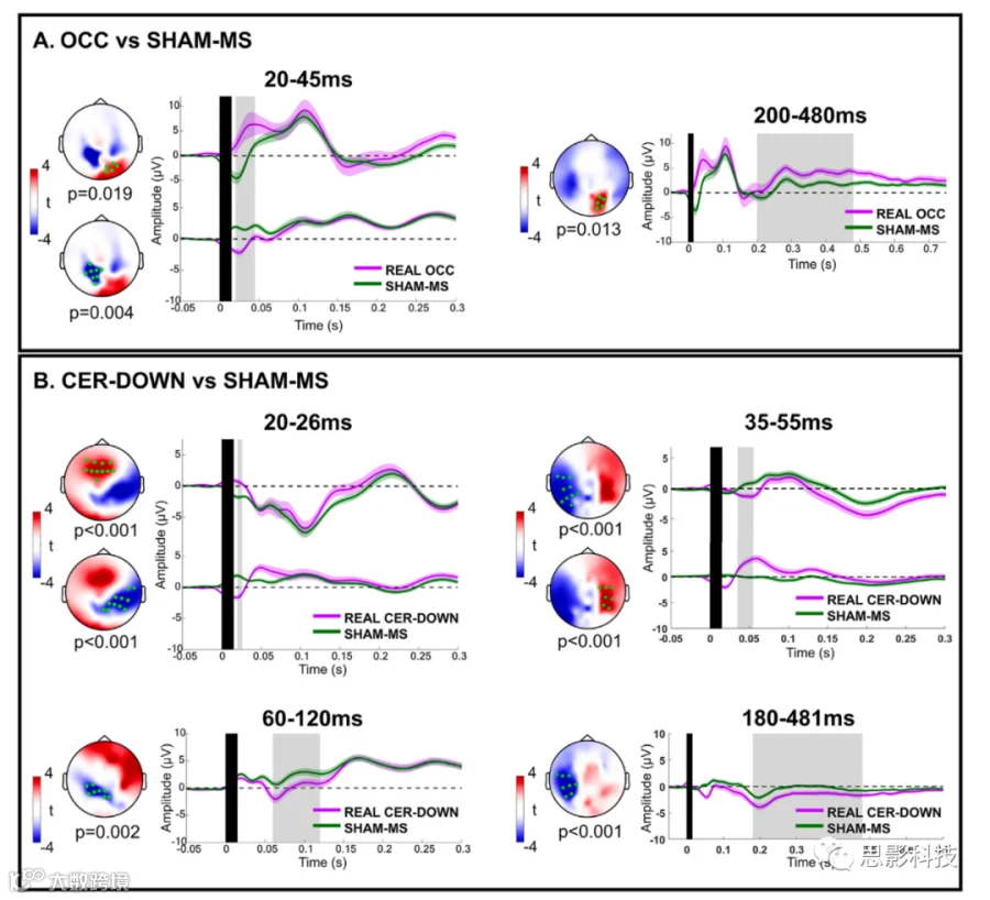A. 右侧枕叶TMS(OCC)与SHAM-MS;B. 带向下电场的cbTMS(CER-DOWN)与SHAM-MS。拓扑图显示了基于簇的t统计结果(REAL – SHAM-MS),标示了显著簇的时间窗口和p值。标记为绿点的EEG通道表示显著簇。每个显著簇包含的电极的平均信号时间进程显示在右侧相应的图中(黑条:刺激时间(0秒)和受刺激伪迹污染的数据排除期;灰色阴影区域:簇的显著时间窗口;紫色:REAL;绿色:SHAM-MS;阴影区域对应±1标准误差SEM)。