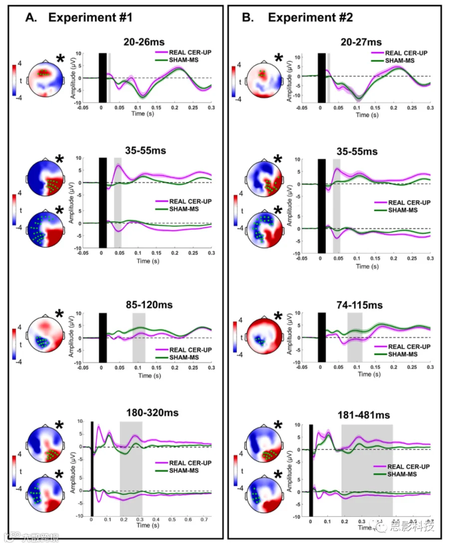 图5. 实验#1(A)和实验#2(B)中cbTMS(CER-UP)与假程序(SHAM-MS)的TMS-EEG反应比较。拓扑图表示了基于簇的t统计结果(REAL – SHAM-MS),以及显著簇的时间窗口。星号表示p < 0.001。标记为绿点的EEG通道表示显著簇。每个显著簇包含的通道的平均信号的时间进程显示在右侧相应的图中(黑色条:刺激时间(0秒)和由刺激伪迹污染的数据排除期;灰色阴影区域:簇的显著时间窗口;紫色:REAL;绿色:SHAM-MS;阴影区域对应±1 SEM)。