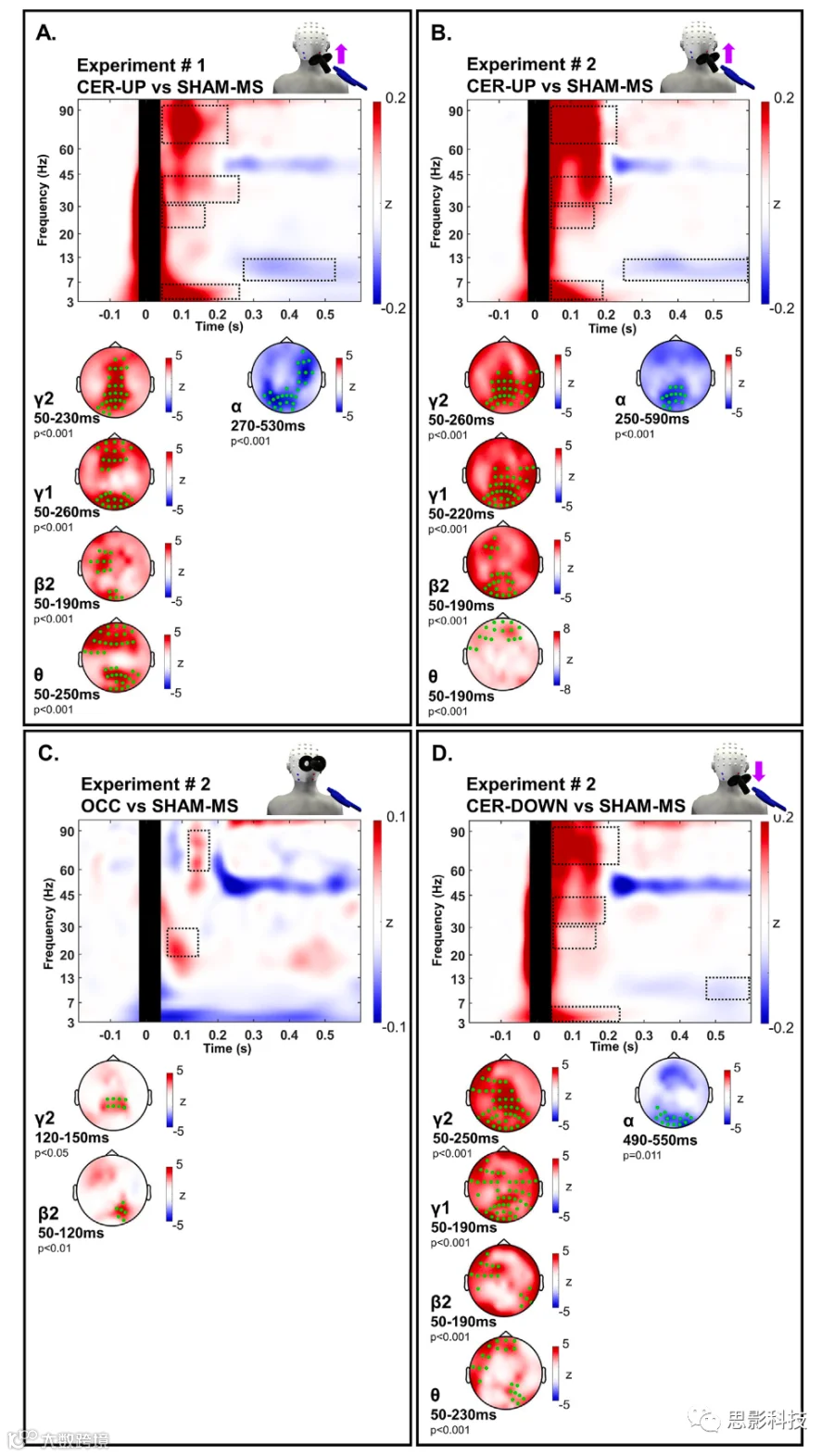 A.-D. 分别为实验#1和#2的CER-UP,OCC和CER-DOWN。时间-频率图展示了REAL和SHAM-MS条件下振荡响应的差异(REAL – SHAM-MS),这是跨所有通道和所有受试者的平均值。黑条指示刺激时间(0秒)和受刺激伪迹污染的数据排除期,虚线框表示发现显著簇的频率和时间窗口。拓扑图表示在发现显著簇的频率和时间窗口内平均功率差(REAL – SHAM-MS)。每个显著簇的频率带、时间窗口和p值旁边标示着相应的拓扑图。标记为绿点的EEG通道表示显著簇。每个图的右侧指示相应的校准条,z值是功率谱密度的标准化。