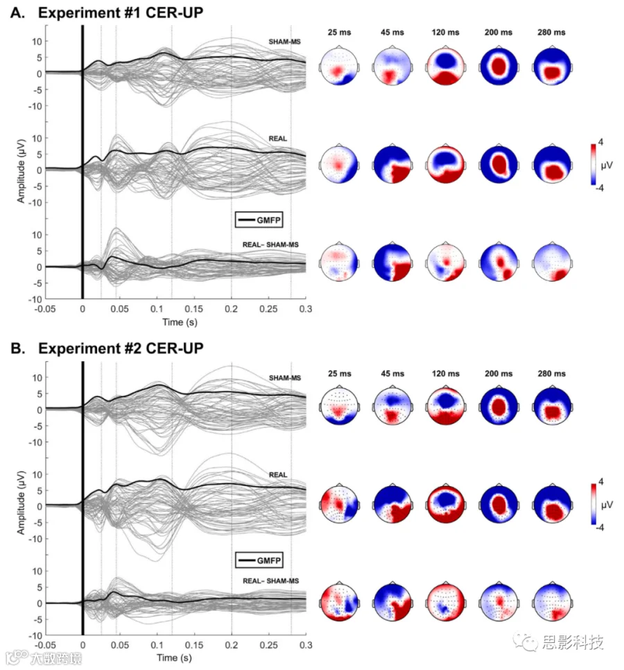 蝴蝶图(左侧)展示了SHAM-MS(顶部)和REAL条件(中间)后的EEG响应的时间进程,以及从REAL中减去SHAM-MS的结果,这些结果是在所有受试者(每个实验23人)上的平均值。每条灰线对应一个EEG通道的信号。黑线代表全局平均场电位。垂直黑条表示刺激发生的时间(0秒)和因刺激伪迹污染而排除的数据期。虚线代表拓扑图(右侧)中展示的时间点。拓扑图中的颜色指示电压(以微伏为单位,如校准条所示)。