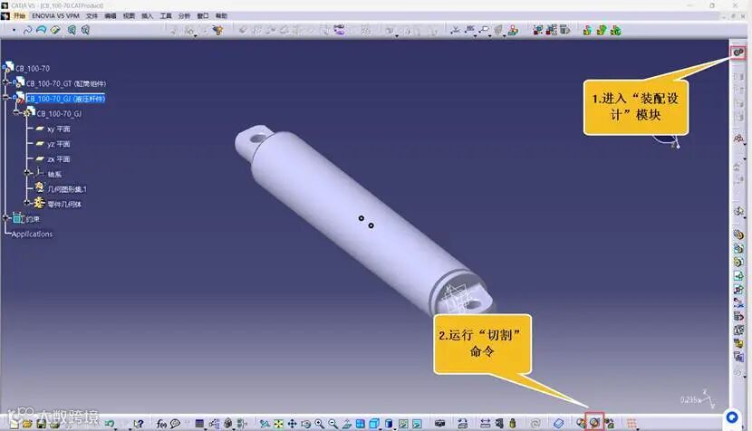 功能按钮:进入“装配设计”模块,运行“切割”命令。