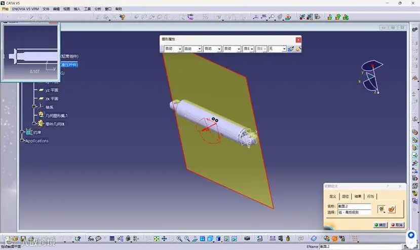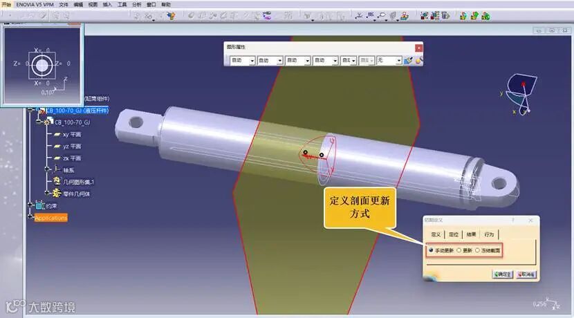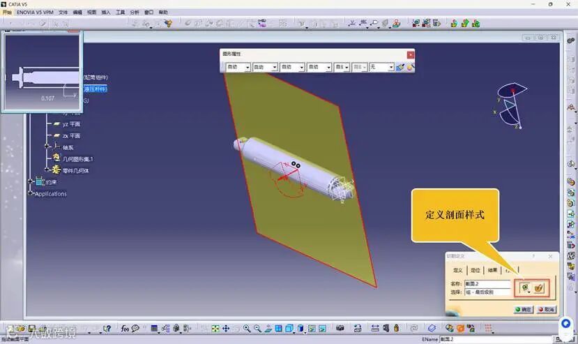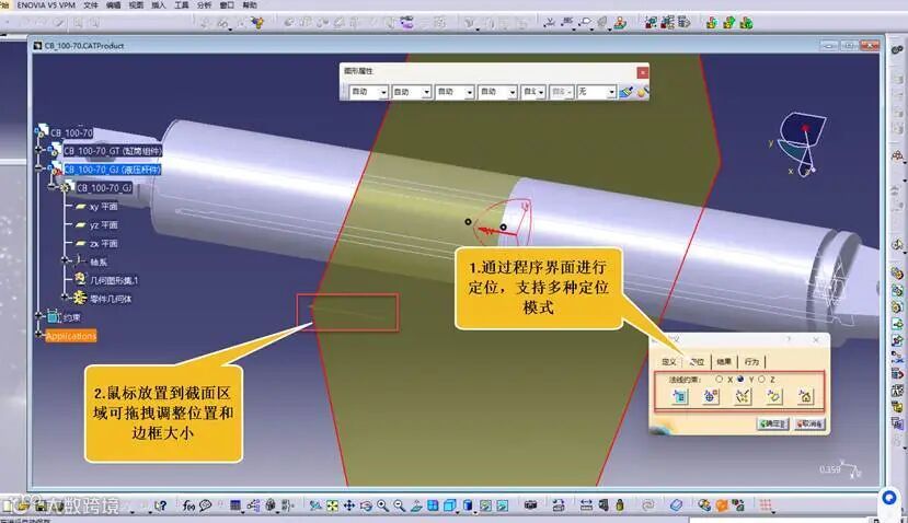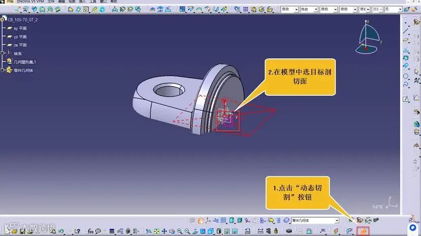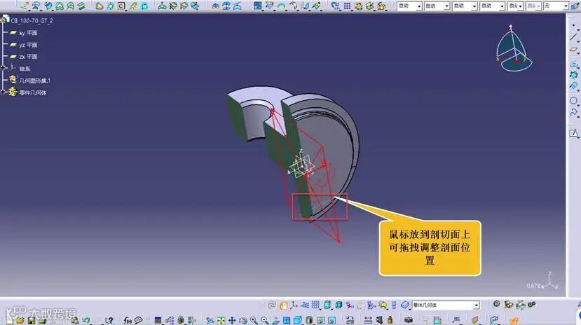 注意:高版本Catia有“截面”功能,点击顶部工具栏"截面"图标,在3D视图中选择基准平面或自定义平面,通过拖动绿色箭头或输入精确数值调整剖切位置。