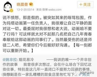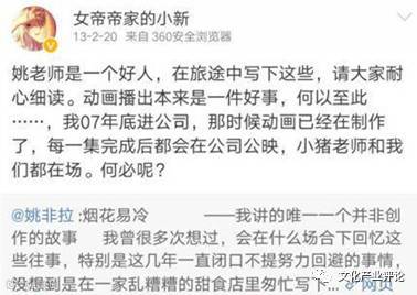 而小新的微博则主要说出因为姚非拉看漫画的眼光不好,导致《狐妖小红娘》一度差点被腰斩,并且对漫画家的作品极端不负责的行为(要知道《狐妖小红娘》之后被腾讯看中,在腾讯漫画连载,之后改编为动画,在B站获得粉丝无数,在最近B站举行的2016动画人气角色大赏中,主角东方月初和涂山苏苏(红红)分别当选男女组冠军,压倒了《秦时明月》等多部国漫的人气角色,可见其人气之高);并且提及当初和夏天岛签订的稿费和版权合同,在请律师想要协商拿回《狐妖小红娘》的版权时姚非拉的恶劣态度。