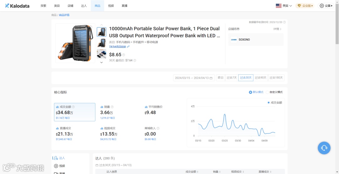 TikTok 近日,一款具备10000mAh大容量、太阳能充电功能的多功能充电宝在美国TikTok站点上取得了惊人的销售成绩。加上运费,售价不超过20美元,据Kalodata数据显示,过去30天日均销量达到1219单,月销售额达34.68万美金,成为SOXONO小店的销售冠军。该产品于12月上架TikTok Shop美国站点,备受关注。