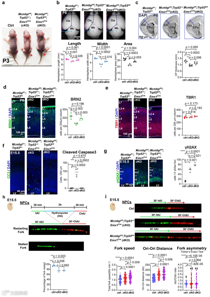 为了进一步地验证这一机制,随后,研究人员构建了同时敲除 Mcmbp 和 Trp53 的双敲除小鼠(dKO),相较于 cKO,没有 p53 的干预后,dKO 小鼠的细胞凋亡现象完全消失(图 3d-g),大脑尺寸也得到了很大程度的恢复(图 3a-c)。然而,在 dKO 小鼠中,DNA 复制叉速度变得比 cKO 小鼠中更快了 (图 3i)。