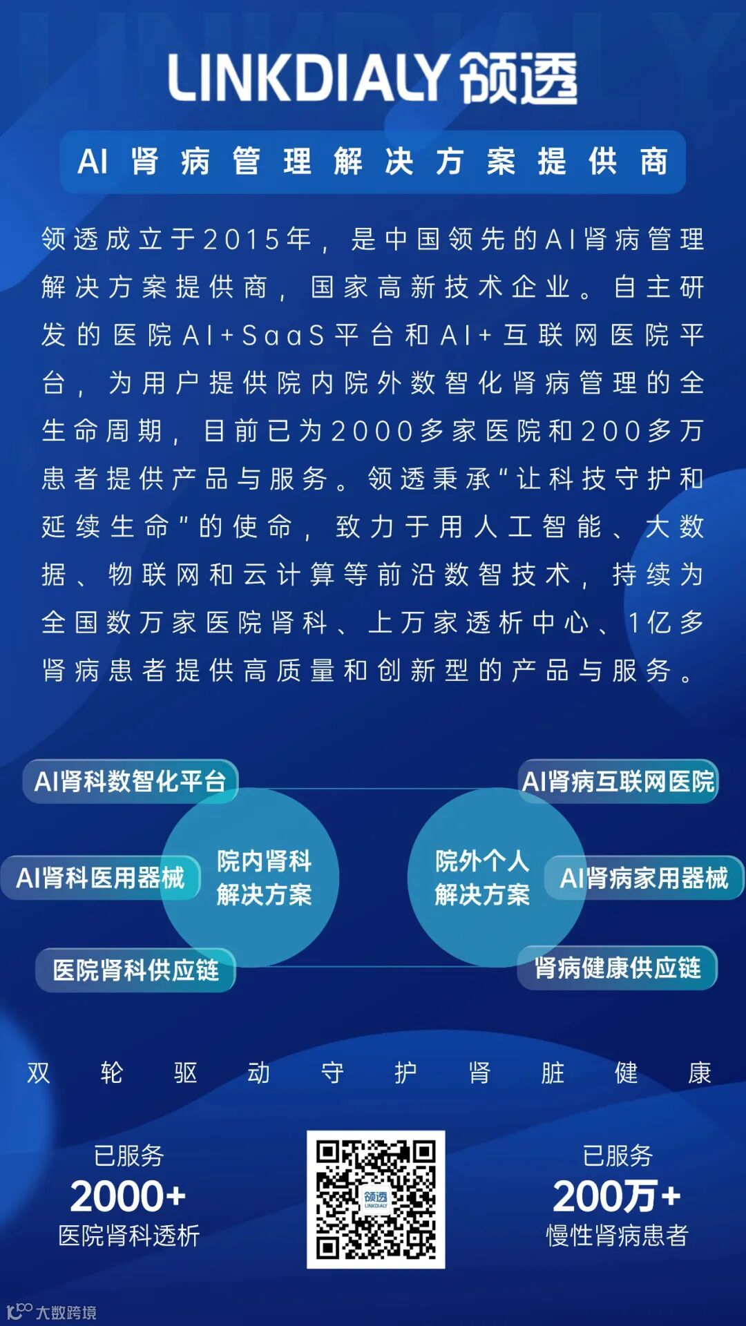 领透,是国内领先的慢性肾病透析数智化平台,用AI+SaaS驱动慢性肾病全生命周期管理的数智化,为行业提供肾病早筛、防控、治疗、管理和康复等全方位的人工智能、数字化和医疗健康产品解决方案,服务全国数千家医院和数百万慢性肾病患者。