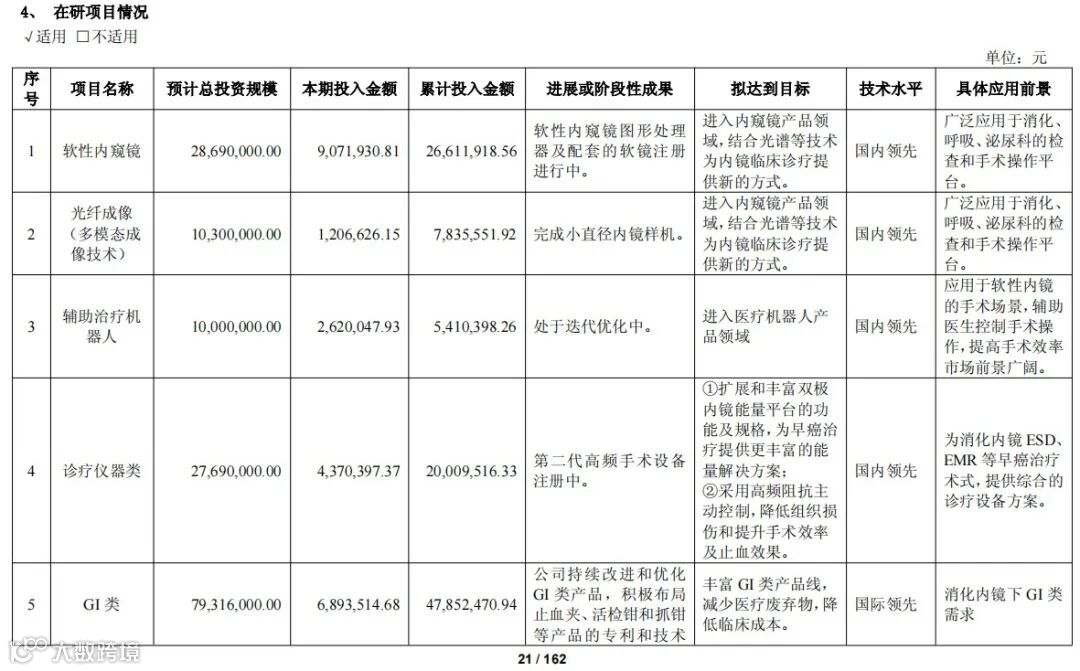 年报显示目前开立有数条消化内镜下器具的在研项目。