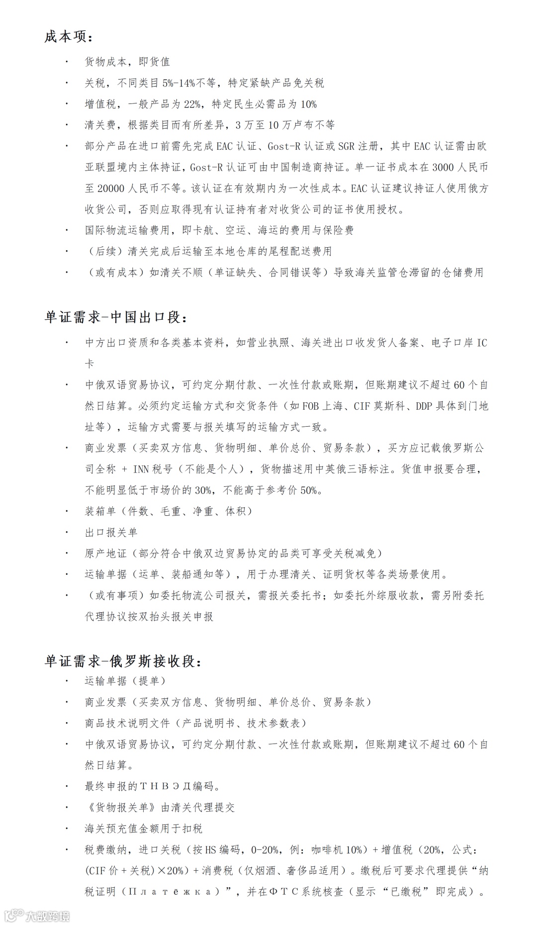 与之相对的是“白色清关”,即货物直接以俄罗斯本土公司的名义报关进口,完整缴纳增值税和关税,获取全套海关凭证的合规模式。其缺点在于,单批货物的直接成本相比灰色清关要高出约20%至30%(俄罗斯清关时以本土公司名义预先缴纳20%增值税和产品关税,取得海关清关单和税票,需要耗时约2~3周)。在销售完成后,企业需凭采购合同、清关单、装箱单等完整文件向银行申请外汇支付,整个过程涉及大量的单据处理与匹配工作。