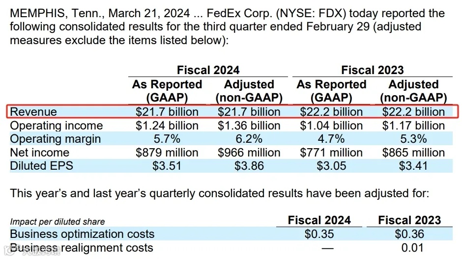 根据FedEx在今年3月底公布的《2024财年第三季度财报》显示,在该季度其营收为217亿美元,明显低于去年同期的222亿美元,也没有达到市场预期的220.4亿美元。