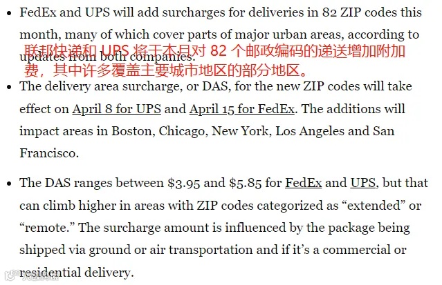 如今UPS的配送区域附加费(DAS)已于4月8日正式生效,而FedEx则将于4月15日(也就是今天)开始实行。