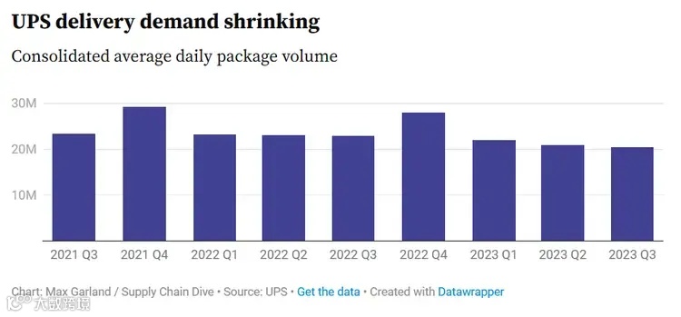 同时,UPS和FedEx两大快递巨头过去一年的营收均出现下滑。具体来看,UPS去年第一季度日均包裹量同比下降5.5%,第二季度继续下降9.5%,到第三季度降幅进一步扩大到10.9%;同一时间段FedEx包裹量也出现了连续下滑的情况。