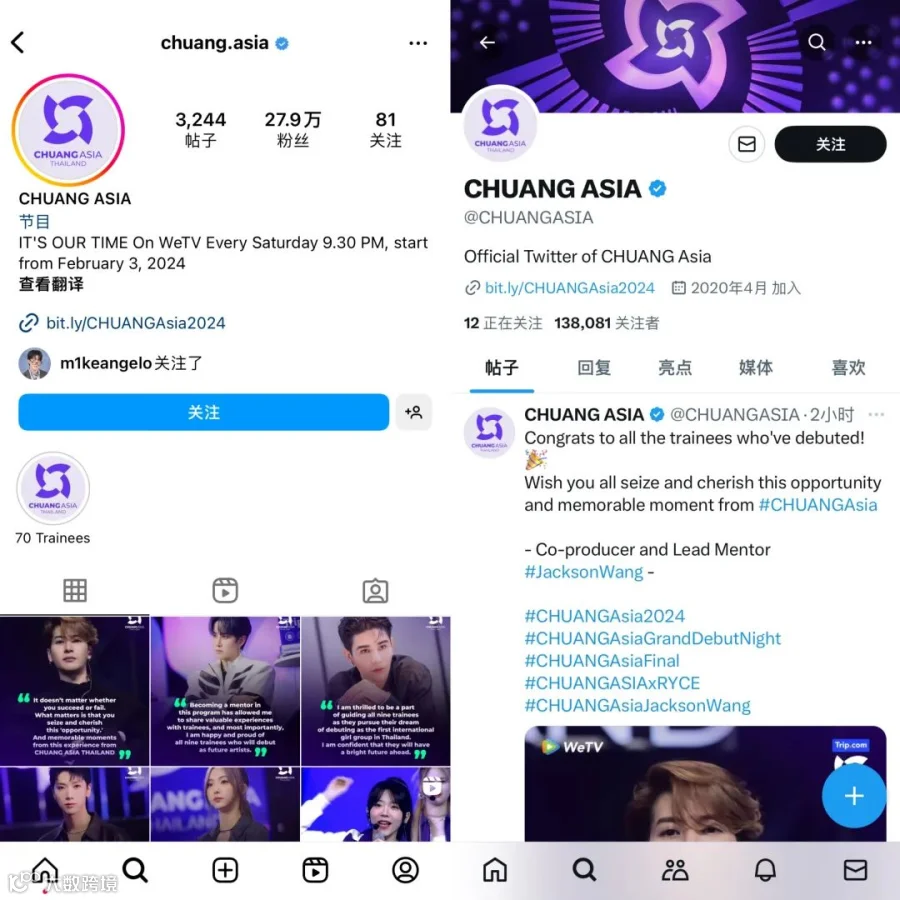 我们看到,《创造营亚洲》在Twitter、YouTube、Instagram、Tiktok等海外平台上均有节目和选手个人的官方账号,及时更新节目相关信息和花絮片段。截止目前,节目官方的Instagram账号已有近28万粉丝关注,成功出道、成绩领先的选手们在海外平台上的粉丝数和点赞量也在持续攀升。
