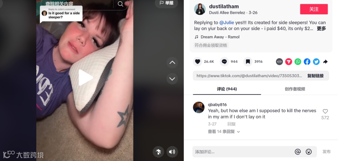 蝶形记忆棉枕头商家正是选择了这一途径,他们在Tik Tok上与专门分享生活好物的博主@dustilatham合作。