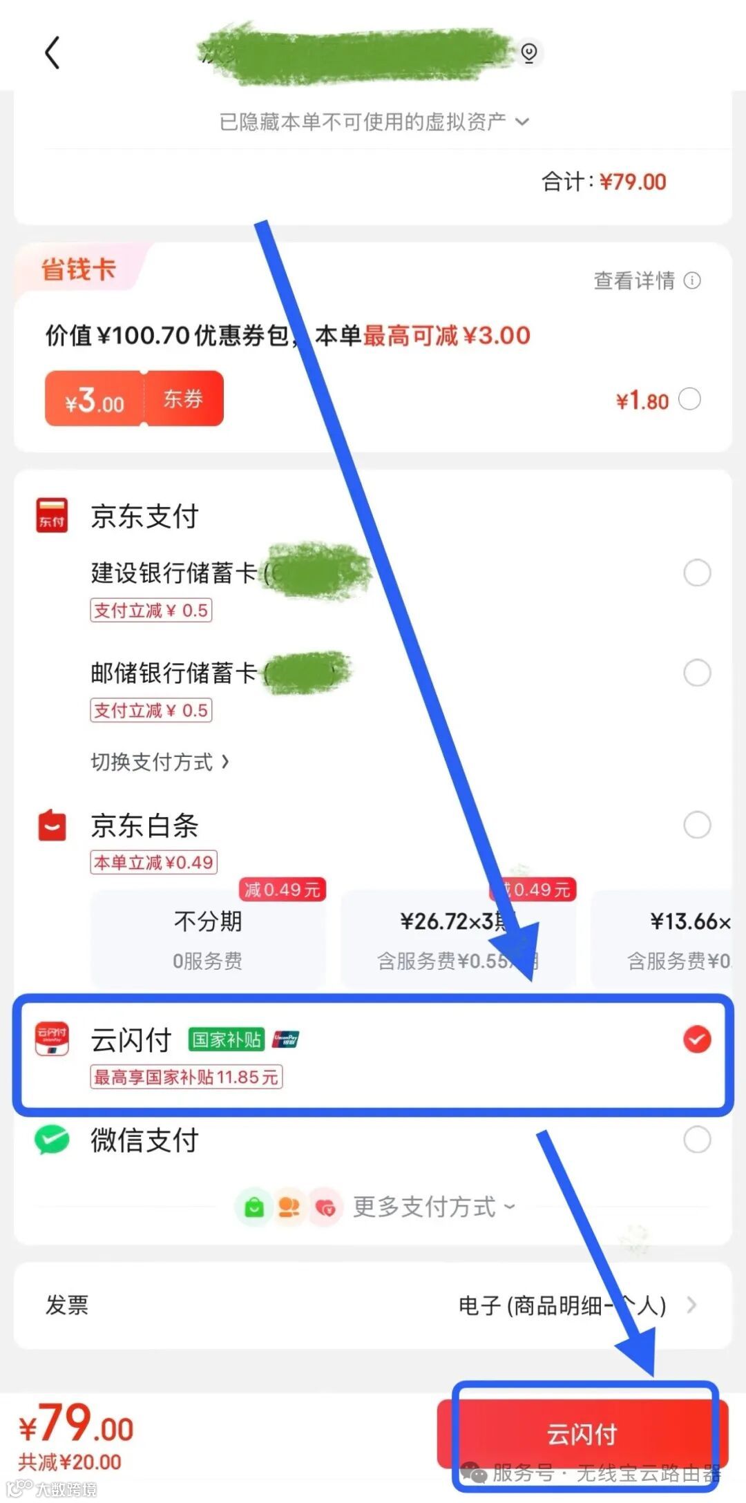 第三步:支付方式选择“云闪付”即可