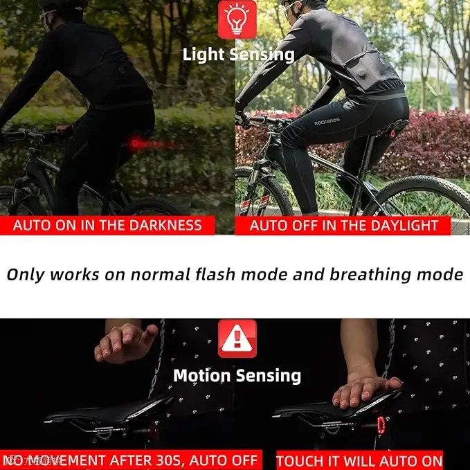 ROCKBROS有一款配备警报功能的灯,在刹车或振动时尾灯会自动以最大亮度亮起,以提醒他人骑车人正在减速。同时有光感功能,在光线暗淡处和有人、物接近时自动亮起,其他情况默认关闭,以节省电池用量。