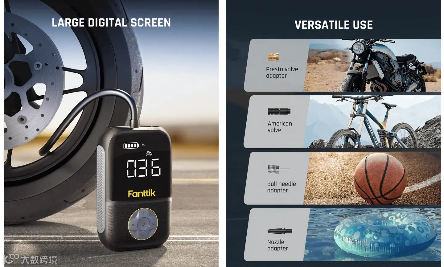 骑行配件出海界曾经的TikTok爆款,2023年12月连续2周登上TikTok Shop美国小店工具与硬件类周榜TOP2。与传统打气筒对比,Fanttik这款便携电动充气筒除了充气快速不费力之外,更关键的优势是重量轻、体积小、耗电量小,对于户外骑行来说收纳方便,携带更加无负担。