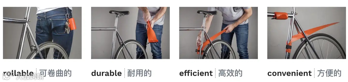 Musguard自称是自行车挡泥板设计的一场革命。它是一套可卷起、可拆卸的、轻便的前后挡泥板组合,可以只在需要时使用,不需要时轻松存放,不破坏车子的整体性,不影响美观。由于轻便+折叠后体积小的特性,它甚至可以直接悬挂在钥匙扣上。骑行配件出海商家可以参考这类产品设计思路。