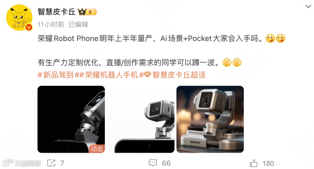 12月7日,博主@智慧皮卡丘 爆料称,荣耀Robot Phone将于明年上半年实现量产,其融合AI场景与Pocket形态的特性引发热议,针对直播、创作等需求的生产力定制优化,更让相关从业者期待。