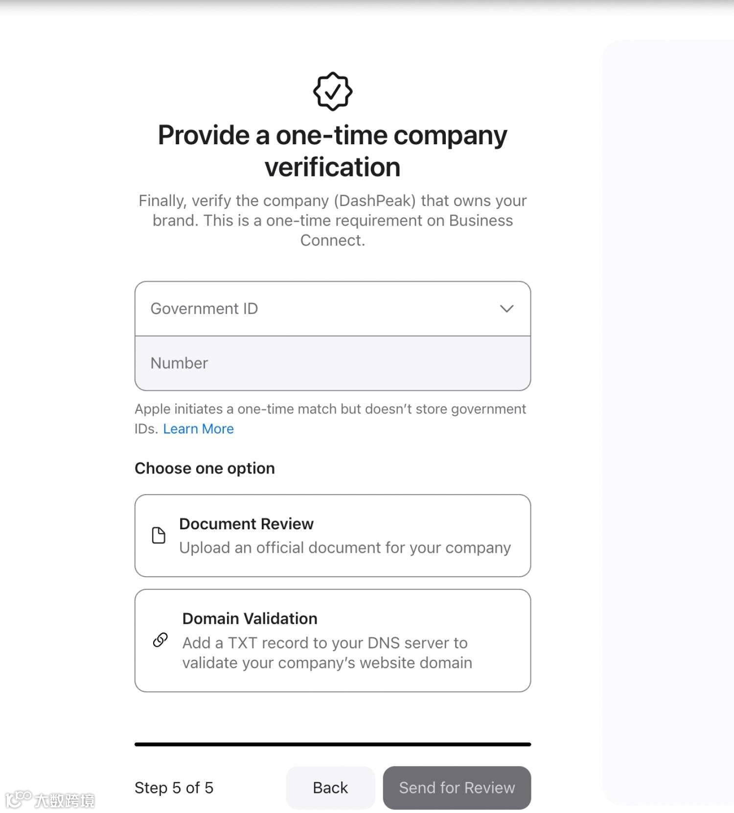 如果是添加新的商户信息,则需要进行公司验证。这是一次性要求,你可以通过文档审查(上传公司的官方文档)或域名验证(向你的DNS服务器添加TXT记录)来验证你的公司。