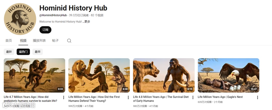 这个频道的视频全部是分享几百万年前的古人类生活的,连旁白配音也没有,但是靠着惊人的一些故事情节,例如古人类被巨蟒或者鲨鱼追杀,视频的长度不宜,有些几个小时,有些只有8分钟,但是很容易吸引住人的目光。