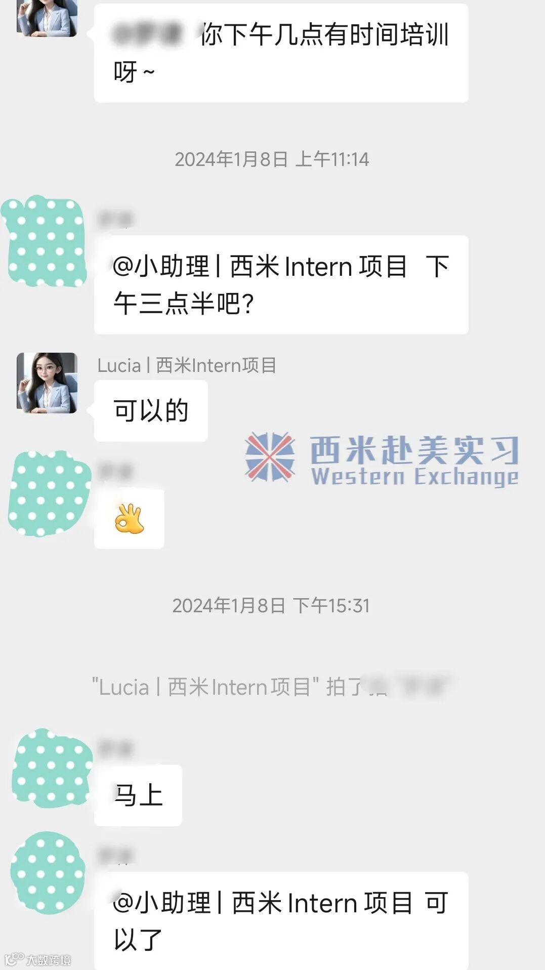于是2023年11月初,我抱着试试看的心态报了名,没想到很快匹配到了岗位。西米老师立马联系我,为我做了面试培训,内容涵盖了从自我介绍到面试官可能会问的问题,以及我可以问面试官的问题等方方面面的小细节,老师也十分的耐心。经过西米的培训,我的面试一次就获得通过,很快拿到了实习单位发的offer。