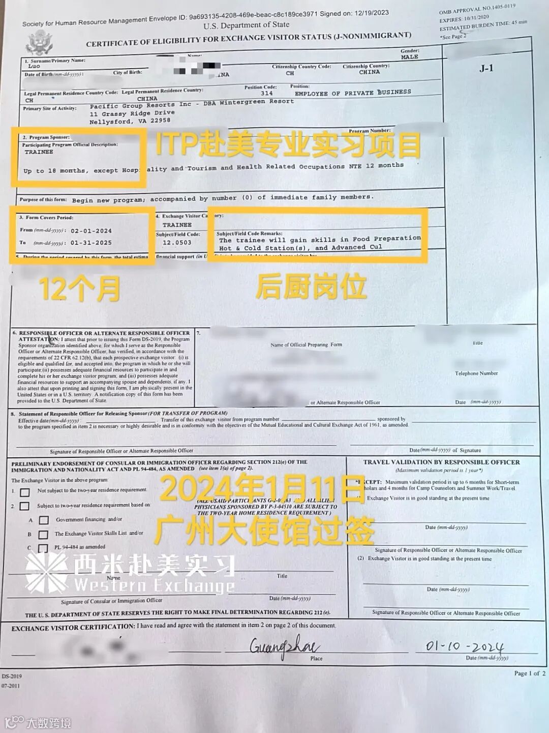 拿到offer后,在西米老师的帮助下,我很快又拿到了DS2019表格。我的项目开始时间是2024年2月1日,拿到表格的我在西米老师的指导下又赶紧申请了签证,并最终于2024年1月在广州顺利拿到了属于我的J1美签。