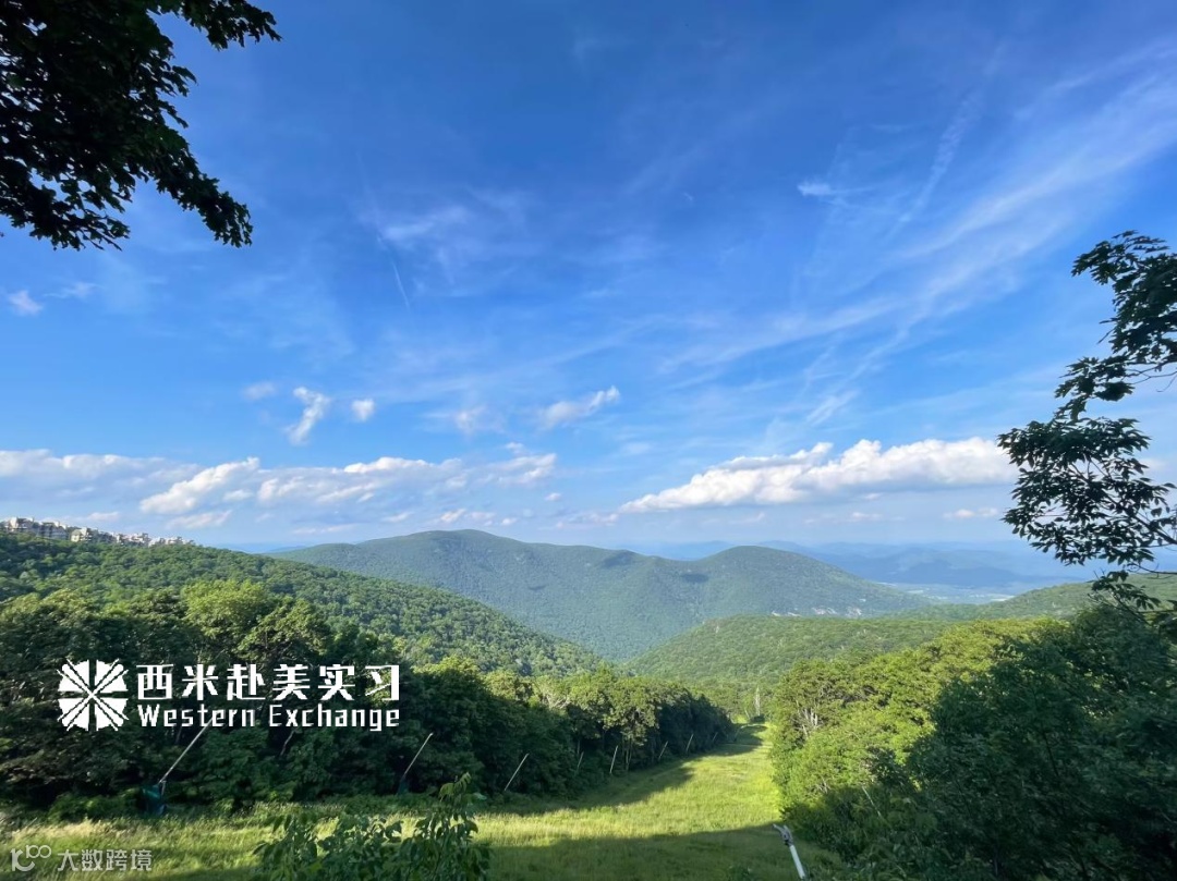 Wintergreen Resort坐落在蓝岭山脉里,冬天是白茫茫的滑雪胜地,夏天则变成郁郁葱葱的徒步天堂。对于酒店的风格就不是很清楚了,但是天空永远蔚蓝色的。浅灰色的建筑嵌在山坡上,阳台外就是落雪的松树。我刚到时恰好还是冬天,齐膝深的雪,到处跑的松鼠,时而出现的鹿,炊烟升腾的房屋,袅袅娜娜的小提琴音,直接氛围感全部拉满。