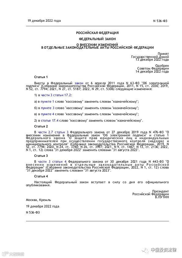 然而,由于实施进度不及预期,俄罗斯联邦总统普京于2022年12月19日签署第536号联邦法律,决定再次延长企业使用现有电子签名的过渡期,截止日期延至2023年8月31日。