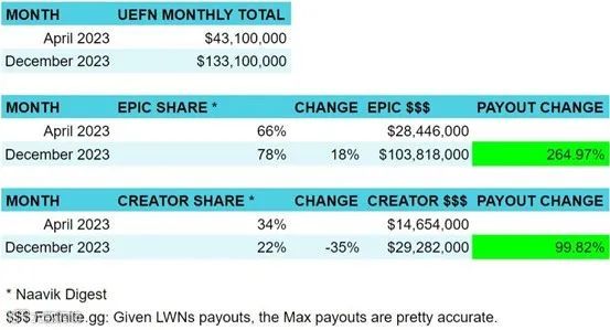 Epic此次的第一方游戏内容活动大幅提高了平台参与度,创作者生态系统也从中受益。为此,LookNorthWorld首席运营官兼联合创始人PatrickMoran也慷慨地分享了UEFN工作室的预计收益。虽然创意地图的参与度下降了35%,但报酬实际上却翻了一番。