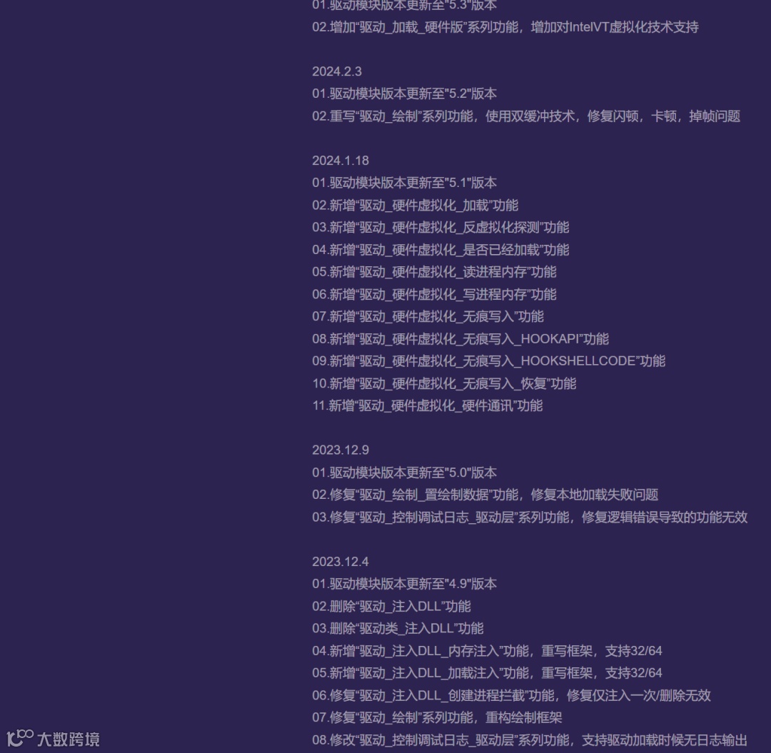 在网址的更新日志中可以找到这个驱动所实现的功能.看起来是一个功能强大的驱动程序.其中不仅仅用来读写内存/还有注入/保护进程/保护窗口/绘制等功能。