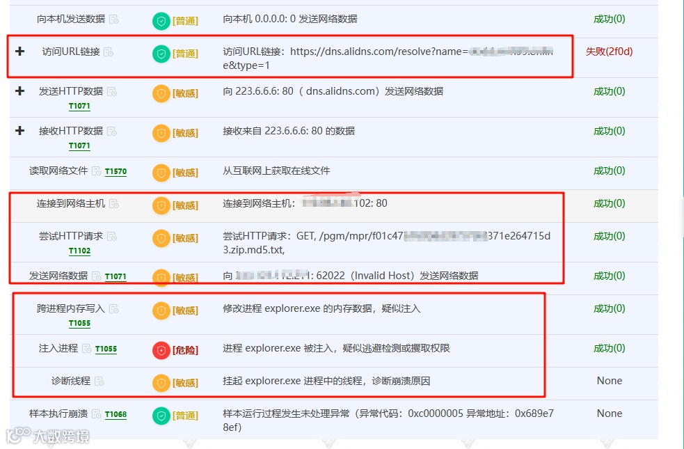 其中打码链接是通过阿里云dns获取域名解析地址,最后是注入 资源管理器进行持久化。