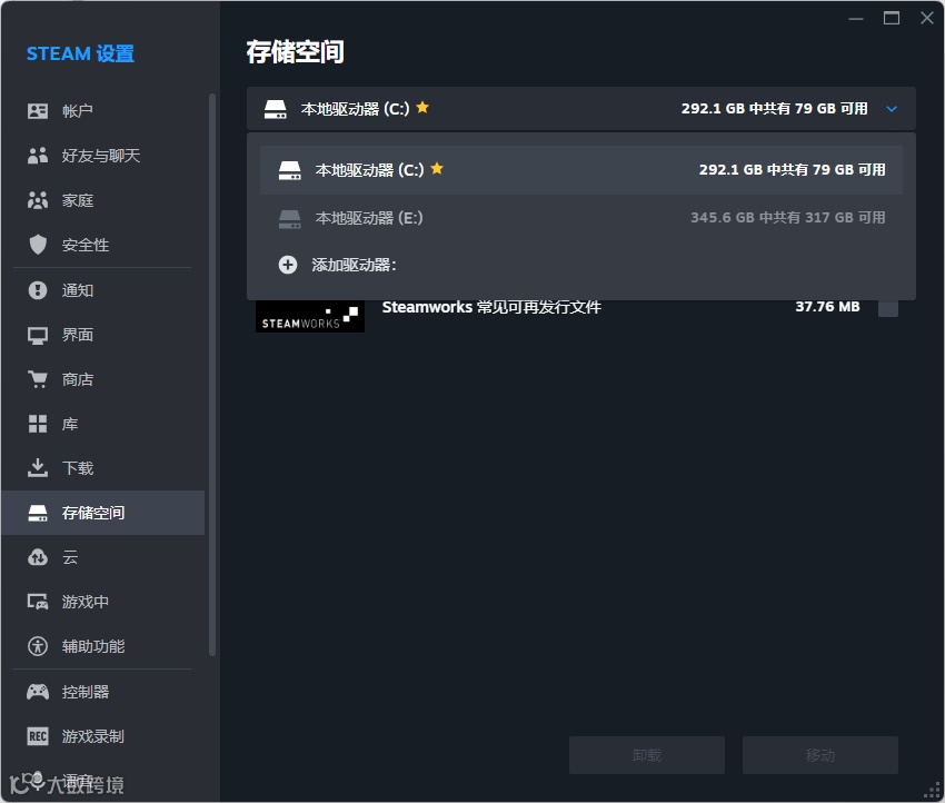 在steam的设置中,在储存空间可以看到你已经安装的游戏,如果说你这里显示只有一个盘,也不用担心,点击右侧的加号就可以添加新的盘符了。
